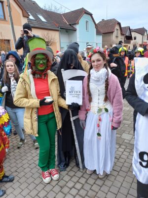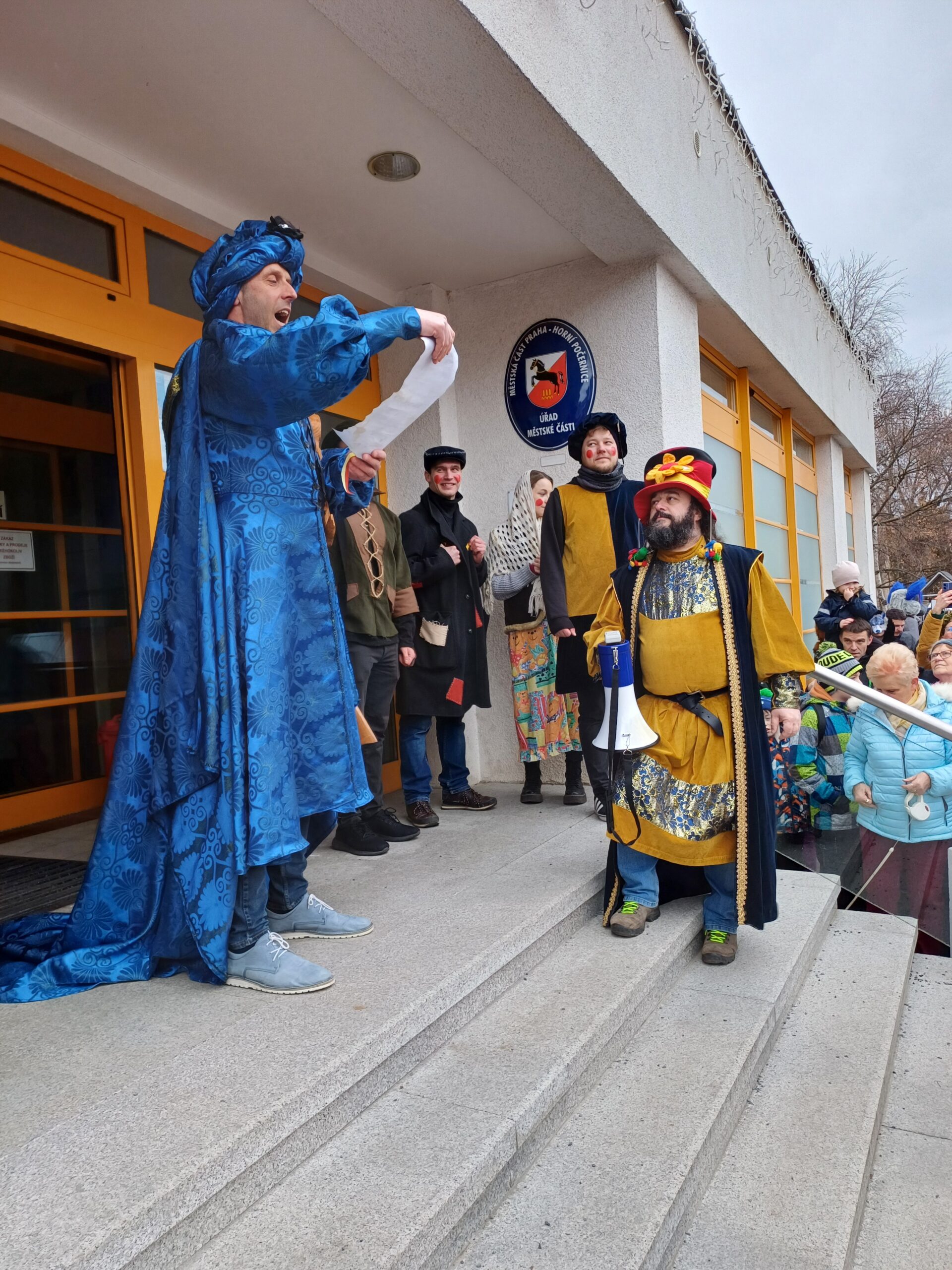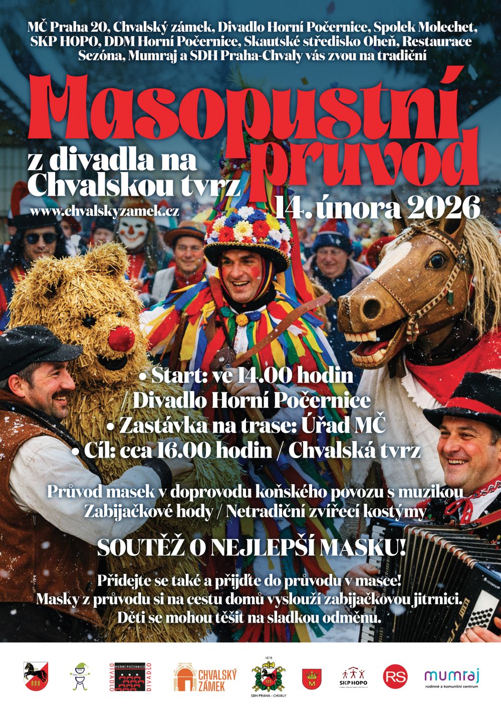 Sejdeme se jako každý rok ve 14.00 hodin u Divadla Horní Počernice, odkud se ulicí Třebešovskou vydáme k Úřadu městské části, kde proběhne první zastavení průvodu. Masopustní masky zde požádají starostu městské části pana Měšťana o udělení masopustních práv – a nemusíte se bát, zatím jsme je vždy úspěšně získali.
