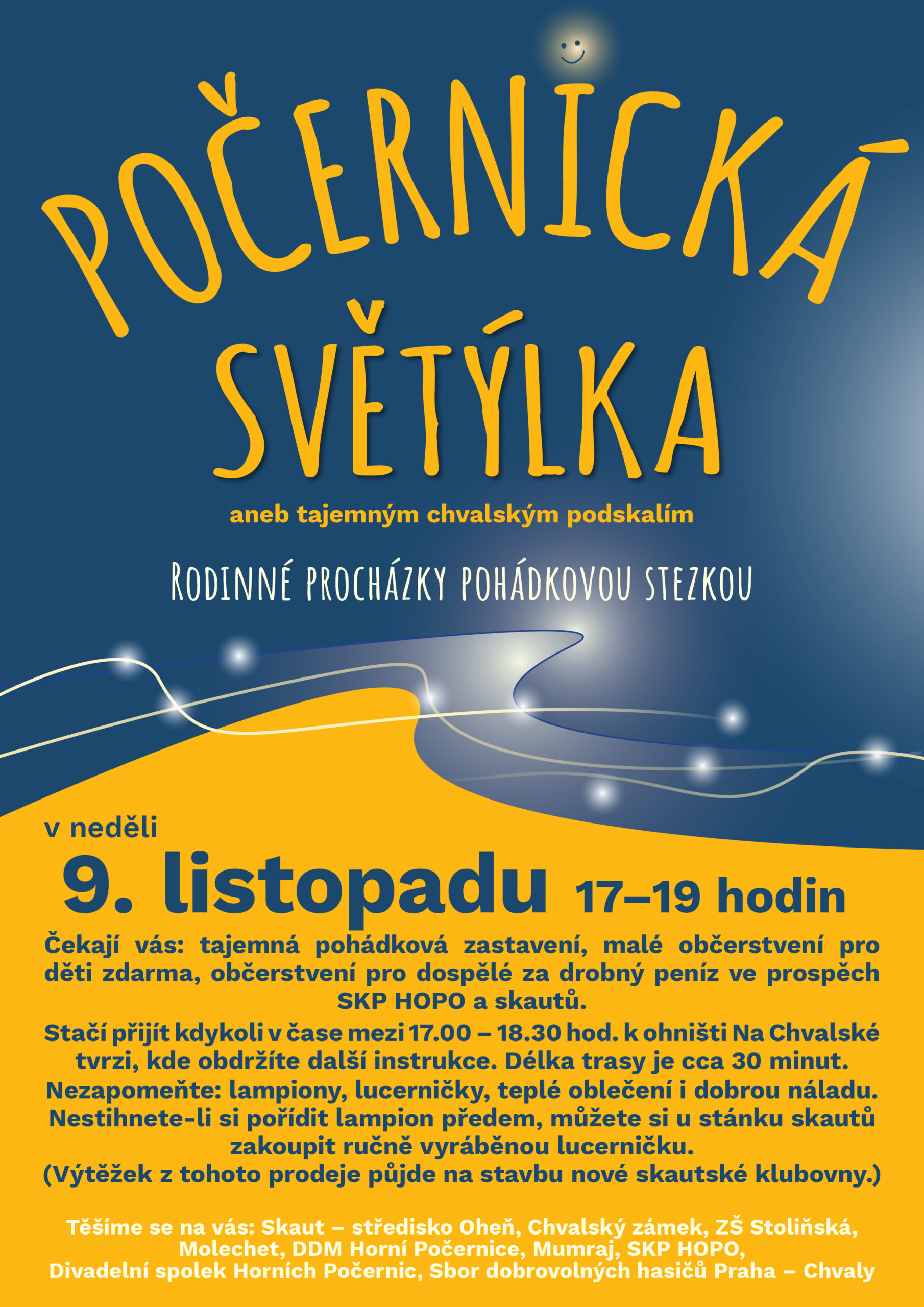 Startujeme na Chvalské tvrzi se setměním, tedy v 17 hodin. Přineste si světýlka nebo lampionky k osvětlení podzimního večera. Odměnou bude malá dobrota na konci cesty a krásný pocit z tajuplného putování.