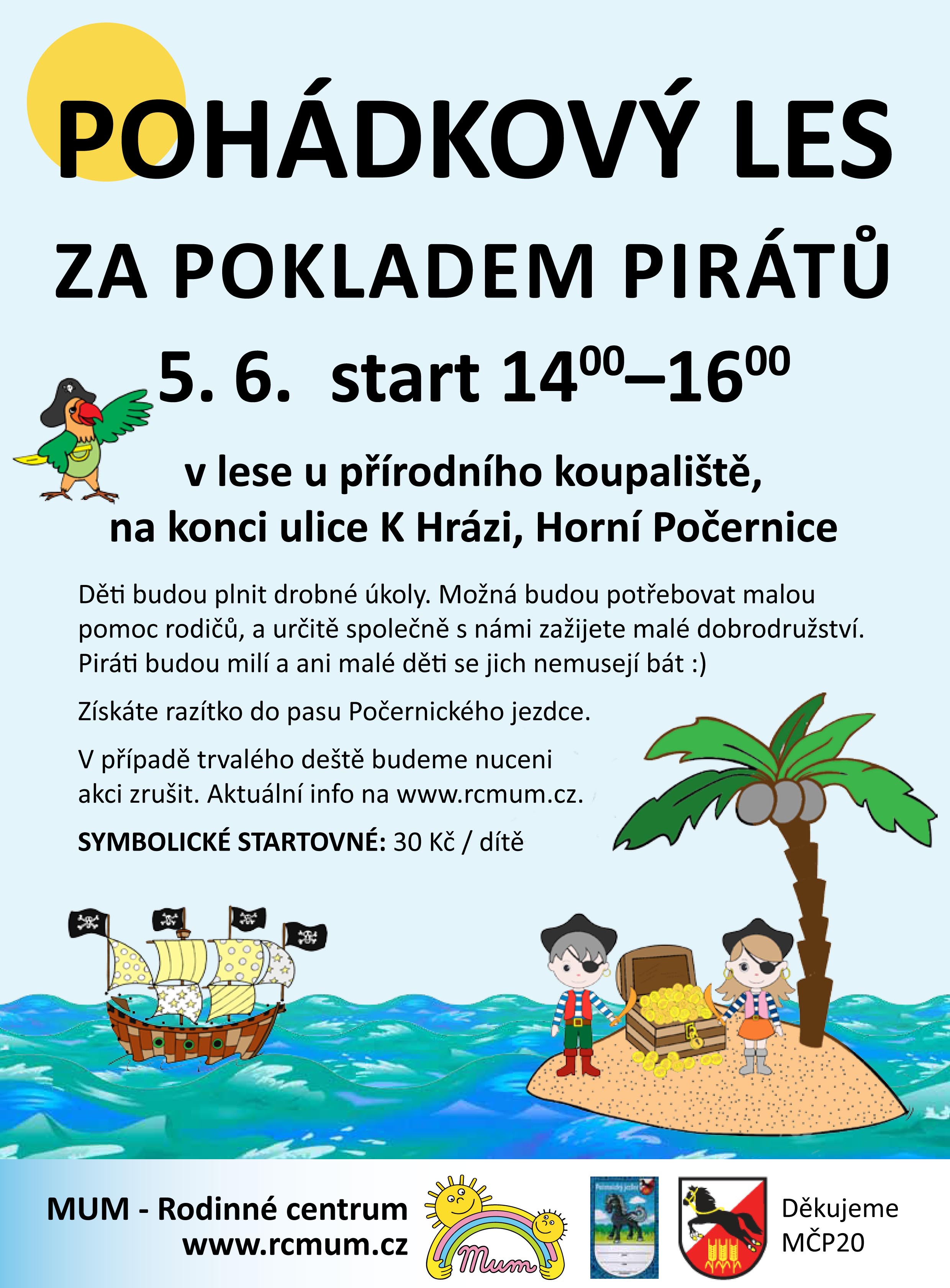 Chcete prožít kouzelné odpoledne v přírodě? Vezměte děti a přijďte na tradiční pohádkový les plný soutěží a dárků. Tento rok vás budou provázet piráti. Piráti budou milí a ani malé děti se jich nemusí bát :) Kdo zvládne – klidně i s pomocí dospěláků – projít celou trasu a splnit úkoly, nalezne na konci cesty pravý pirátský poklad. Děti budou plnit drobné úkoly. Možná budou potřebovat malou pomoc rodičů, určitě budou ale rády, že společně s námi zažijí malé dobrodružství.