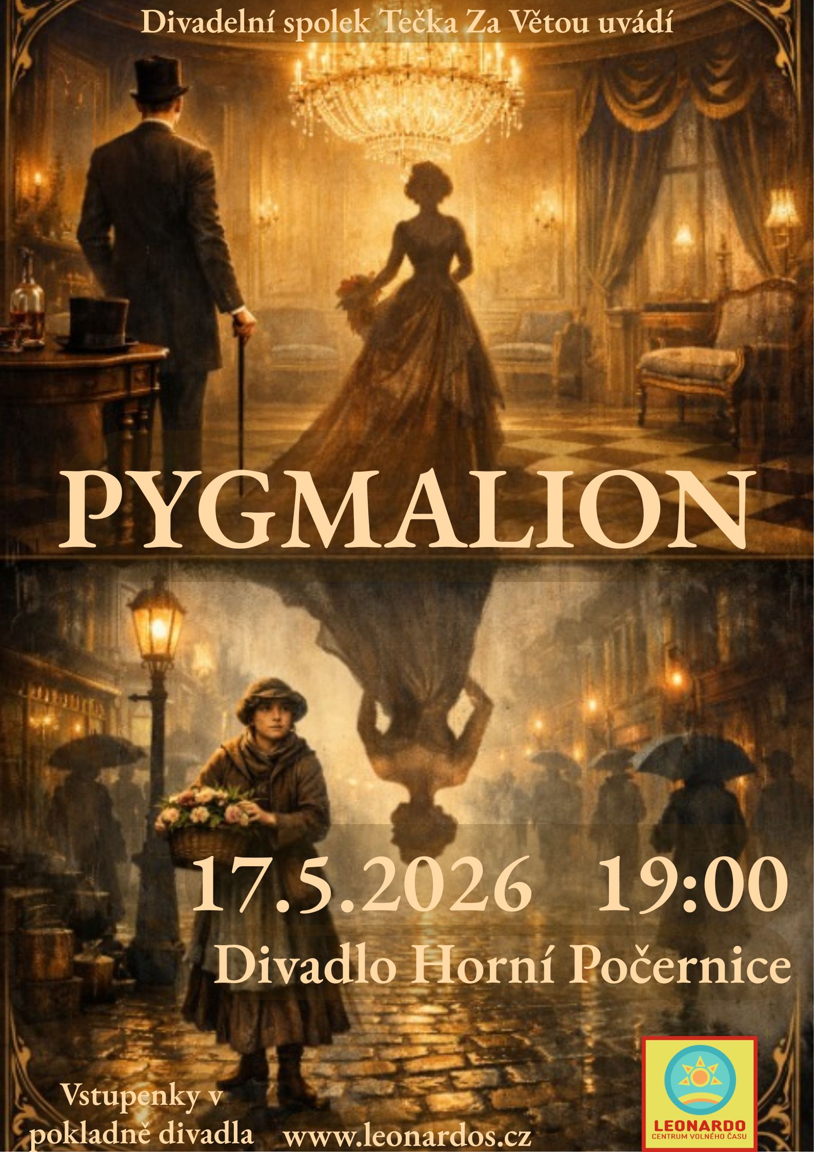 Sázka mezi samolibým profesorem Higginsem plukovníkem Pickeringem spustí jedinečnou proměnu, která změní životy obou profesorů. Pygmalion je příběh o síle slova, lidské hrdosti a o tom, že ke štěstí nestačí jen správná výslovnost. Nechte se unést brilantním humorem a přednesy našich herců, kteří dokazují, že skutečná dáma se skrývá v každé – stačí jí jen dát šanci promluvit.