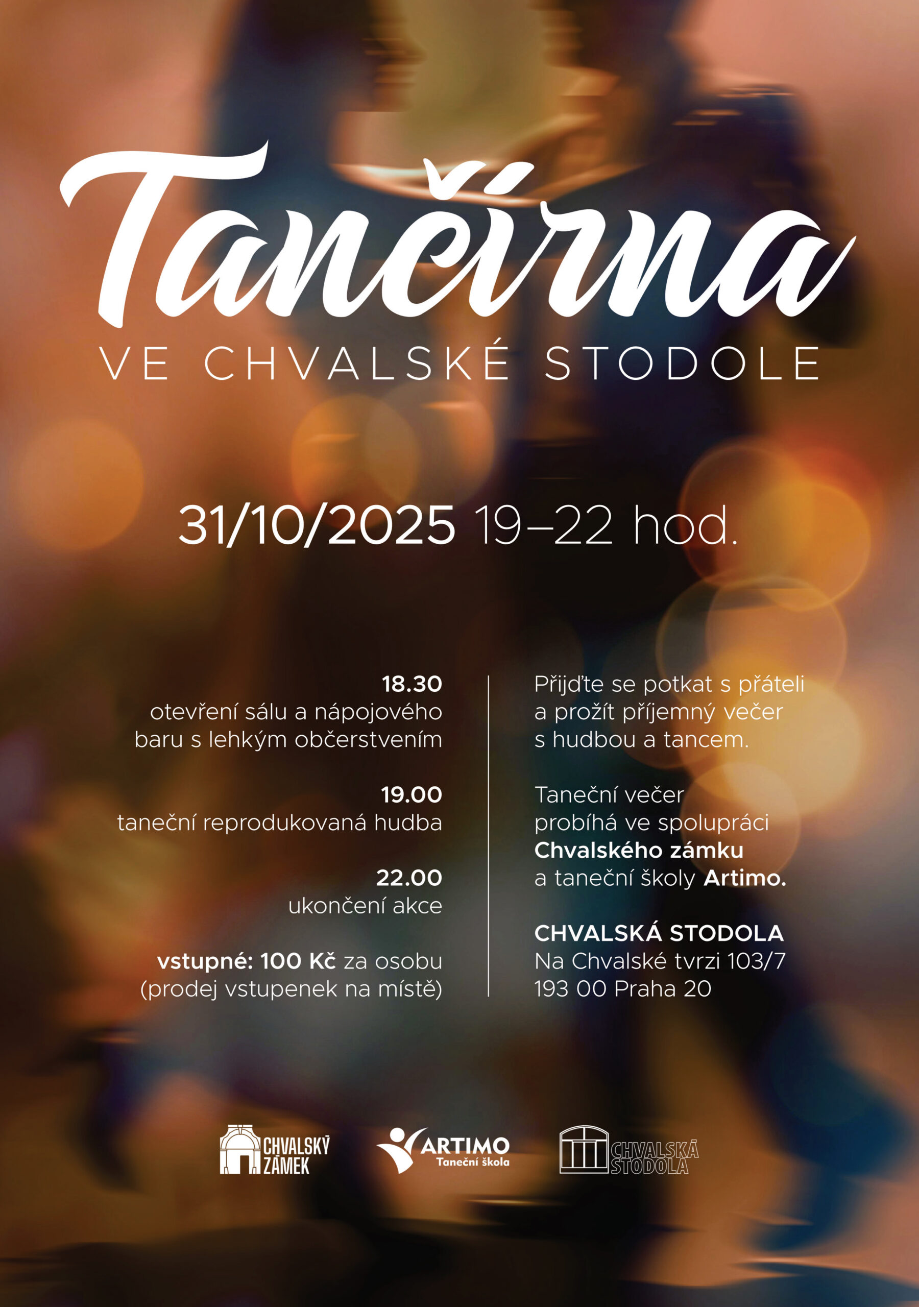Poslední říjnový večer vás srdečně zveme na již tradiční Tančírnu, kterou pro vás připravil Chvalský zámek ve spolupráci s taneční školou Artimo. Pojďte se potkat s přáteli a prožít příjemný večer s hudbou a tancem ve Chvalské stodole.