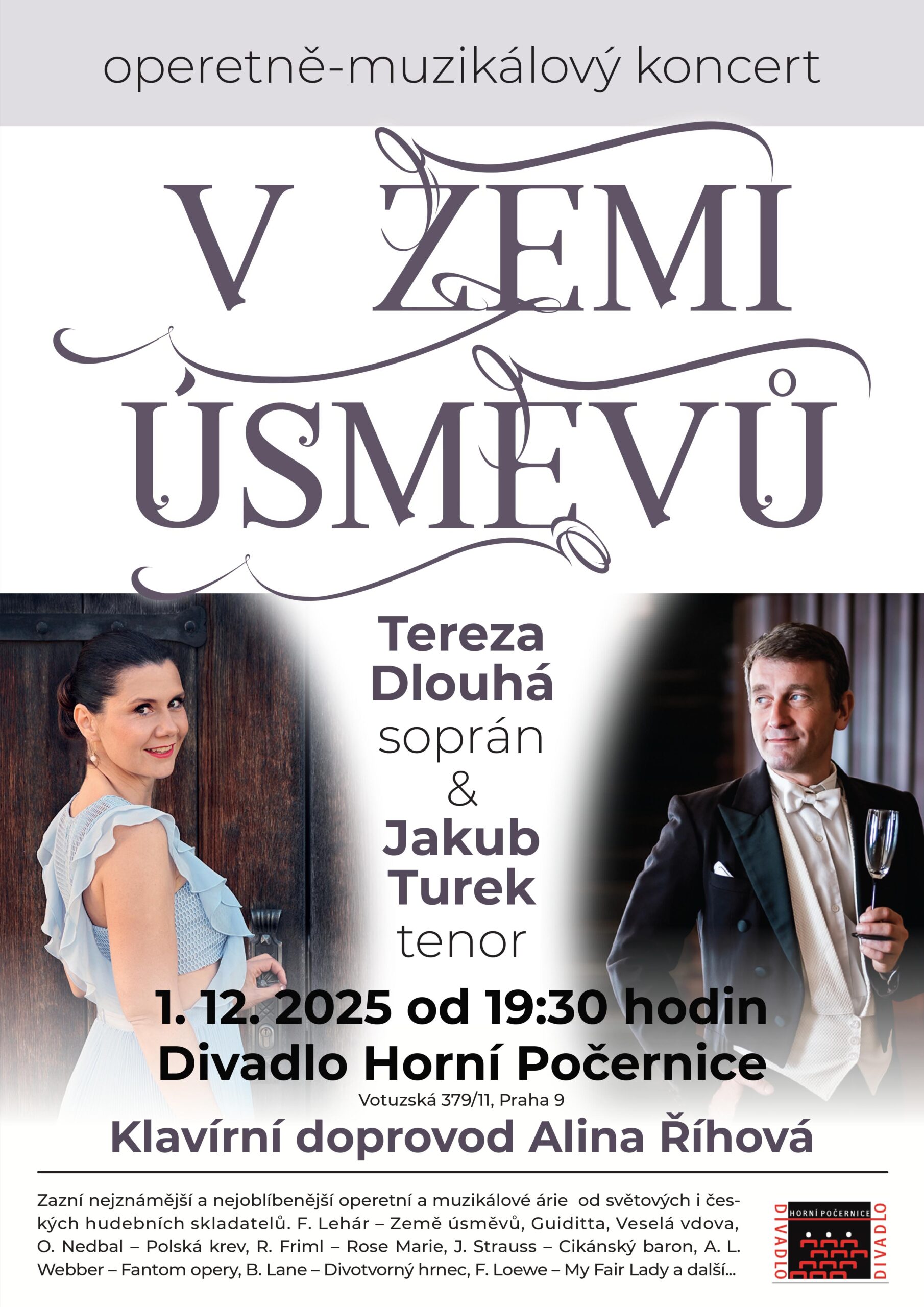 V programu úspěšného koncertu sopranistky Terezy Dlouhé a tenoristy Jakuba Turka zazní nejznámější a nejkrásnější sólové árie i duety z operet Veselá vdova, Země úsměvů, Guiditta, Paganini (F. Lehár), Netopýr, Cikánský baron (J. Strauss), Rose Marie (R. Friml), Čardášová princezna (E. Kálmán), z muzikálů My Fair Lady (F. Loewe), Phantom of the Opera (A.L. Webber) a dalších…
