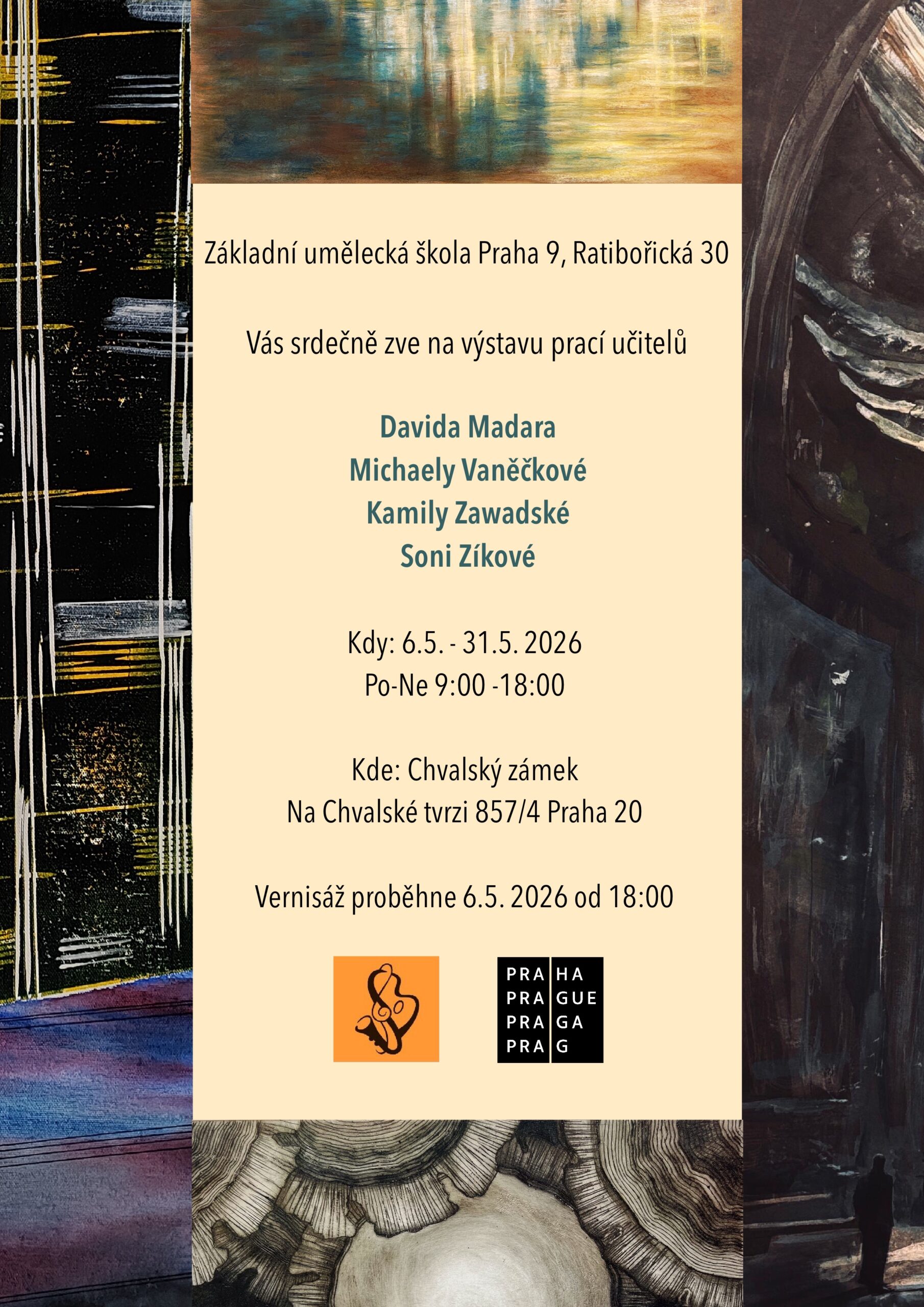Základní umělecká škola Praha 9, Ratibořická 30 se po několika letech vrací na Chvalský zámek s výstavou, kde se představí učitelé výtvarného oboru svými pracemi. Konkrétně David Madar, Michaela Vaněčková, Kamila Zawadská a Soňa Zíková. Jste srdečně zváni!