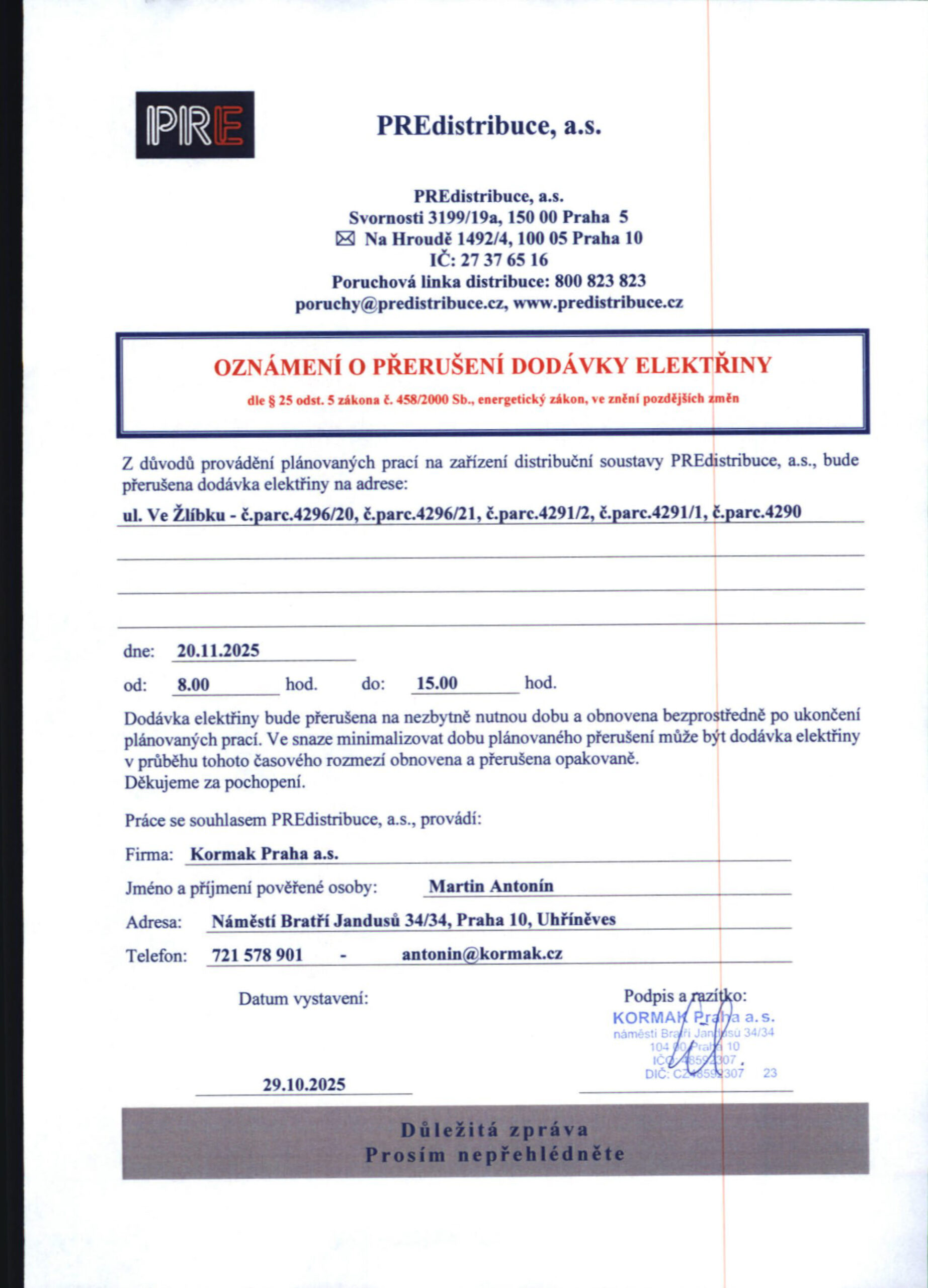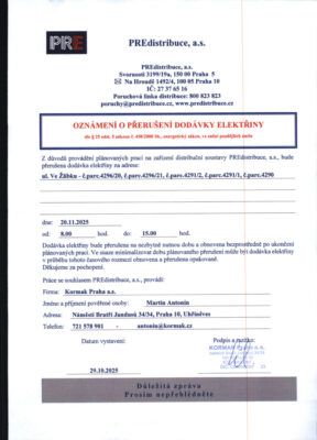 PŘERUŠENÍ DODÁVKY ELEKTŘINY 30.10.2025 | Karolína Prokůpková PŘERUŠENÍ DODÁVKY ELEKTŘINY Dne 20. 11. 2025 bude přerušena dodávka elektřiny od 8:00 do 15:00 hodin pro odběrné místa: ul. Ve Žlíbku – č. parc. 4296/20, č. parc. 4296/21, č. parc. 4291/2, č. parc. 4291/1, č. parc. 4290. Navigace pro příspěvek « Předchozí příspěvek