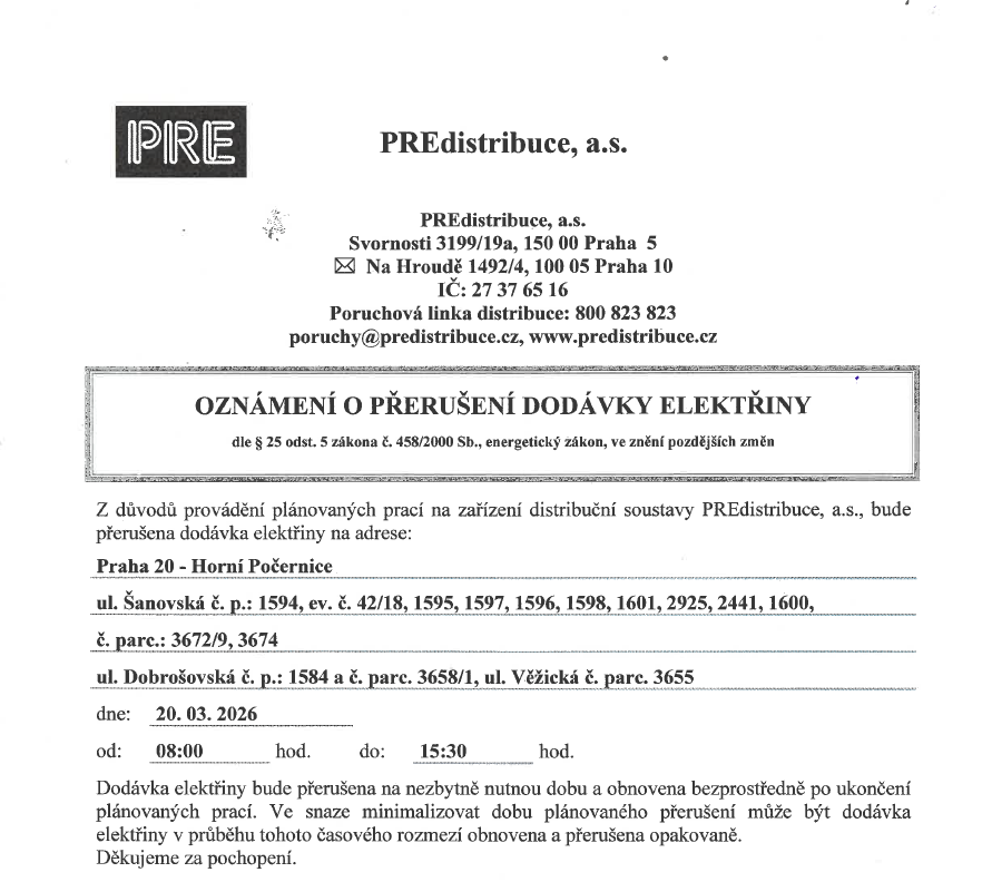 Dne 20. 3. 2026 bude přerušena dodávka elektřiny od 8:00 do 15:30 hodin pro odběrná místa: ul. Šanovská č.p.: 1594, ev. Č. 42/18, 1595, 1597, 1598, 1601, 2925, 2441, 1600, č. parc.: 3672/9, 3674