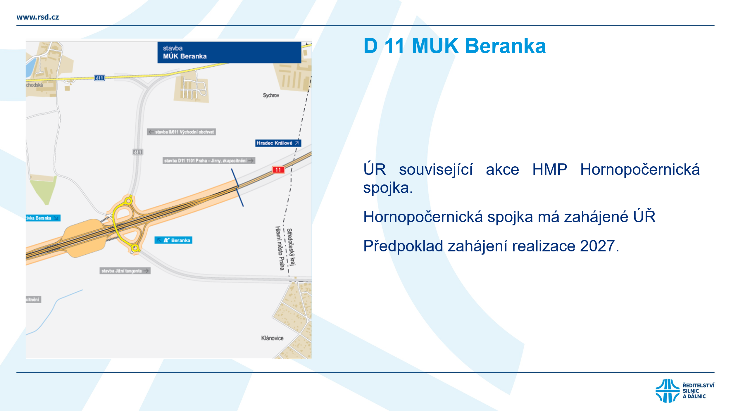 - Hlavní město uzavřelo s Ředitelstvím silnic a dálnic (ŘSD) a Středočeským krajem smlouvu o napojení Klánovic a obce Šestajovice v okrese Praha-východ na dálnici D11. Dopravní investice by měla ulevit dopravě na přetížené silnici II/611 v Horních Počernicích. Všechny stavby by měly být hotové v roce 2020. Finanční podíl Prahy bude přibližně 70 milionů korun. Hlavní město podle plánu zaplatí hornopočernickou spojku, která má být zároveň obchvatem Horních Počernic, zatímco mimoúrovňovou křižovatku Beranka bude financovat ŘSD a klánovickou spojku kraj. Praha se na záměr pokusí získat peníze ze Státního fondu dopravní infrastruktury. Část nákladů ponese podle náměstka primátorky pro dopravu Petra Dolínka také developer, který chce u Klánovic stavět byty. Hlavní město, kraj a ŘSD se ve smlouvě zavazují, že budou postupovat tak, aby územní rozhodnutí bylo vydáno do prosince příštího roku a stavební povolení do března roku 2018.